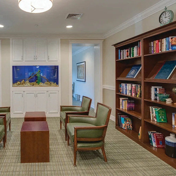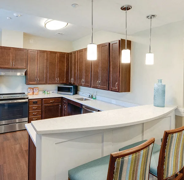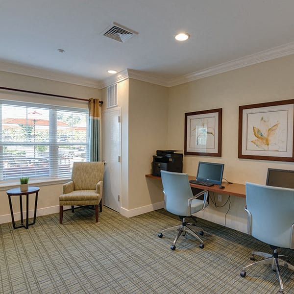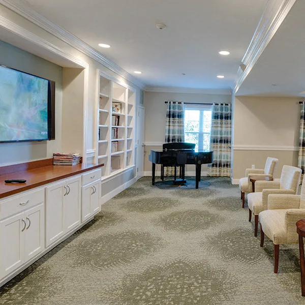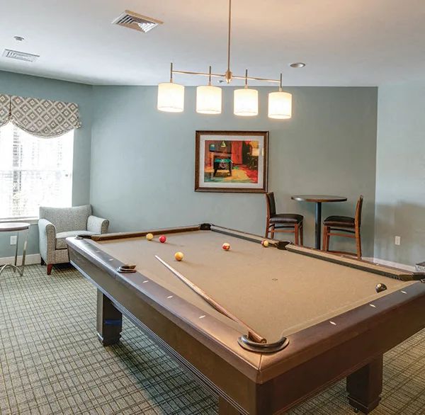 A variety of luxurious amenities are offered directly onsite including a community room with a fireplace, theater room with a large screen TV and fitness and wellness rooms. In addition, residents can enjoy arts and crafts and a game room with a billiard table!